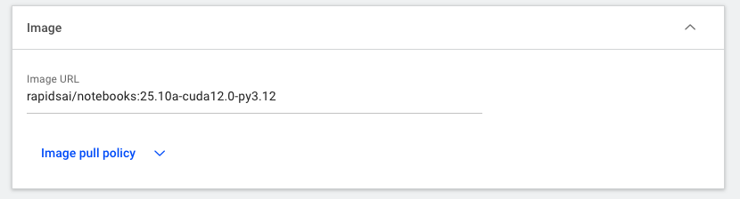 Insert the URL of the docker image. In this example, we’re pulling an NVIDIA Rapids docker image from Docker Hub with specific rapids, CUDA, and python versions: rapidsai/notebooks:25.10a-cuda12.0-py3.12
