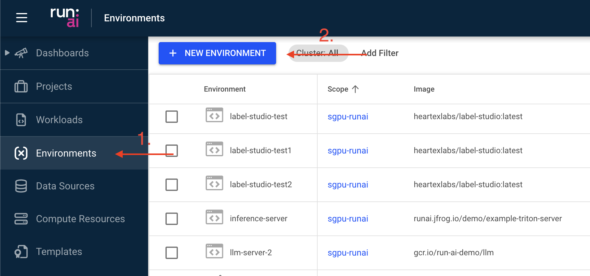 In Run:AI, an environment is a configuration that defines the software setup needed to run your AI workloads. An environment typically includes: