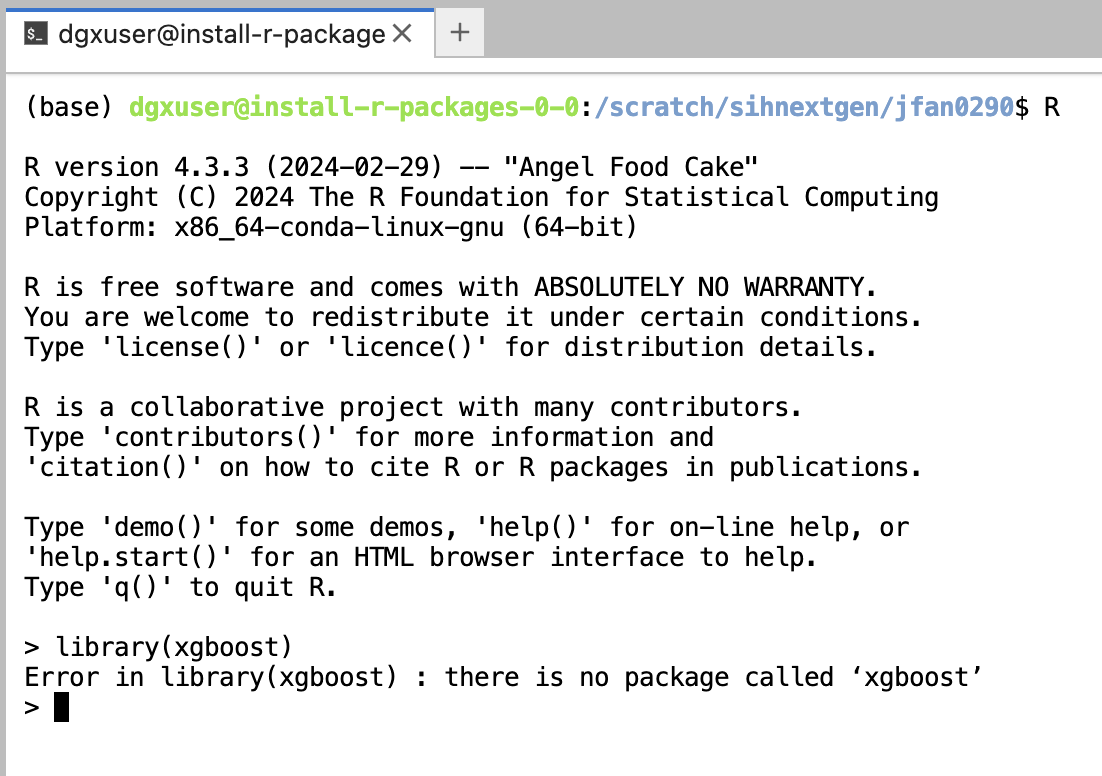 R_LIBS_USERenvironment variable to point to this new directory.export R_LIBS_USER=/scratch/${RUNAI_PROJECT}/my_username/R_libsStart R by executing the command