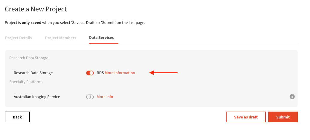 Confirm RDS is enabled If you want to create a separate new project for managing cluster access, ensure that you select “Research Data Storage” when creating the project: