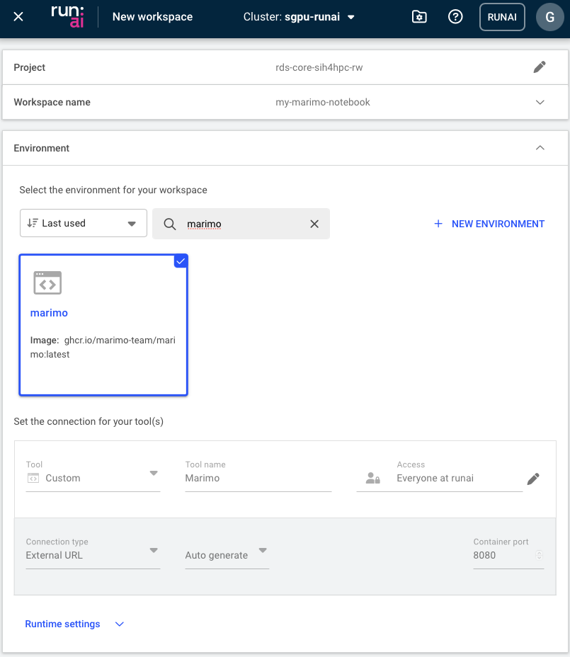 - Select an environment to create the container. The SIH team has set up the marimo:latest container image (