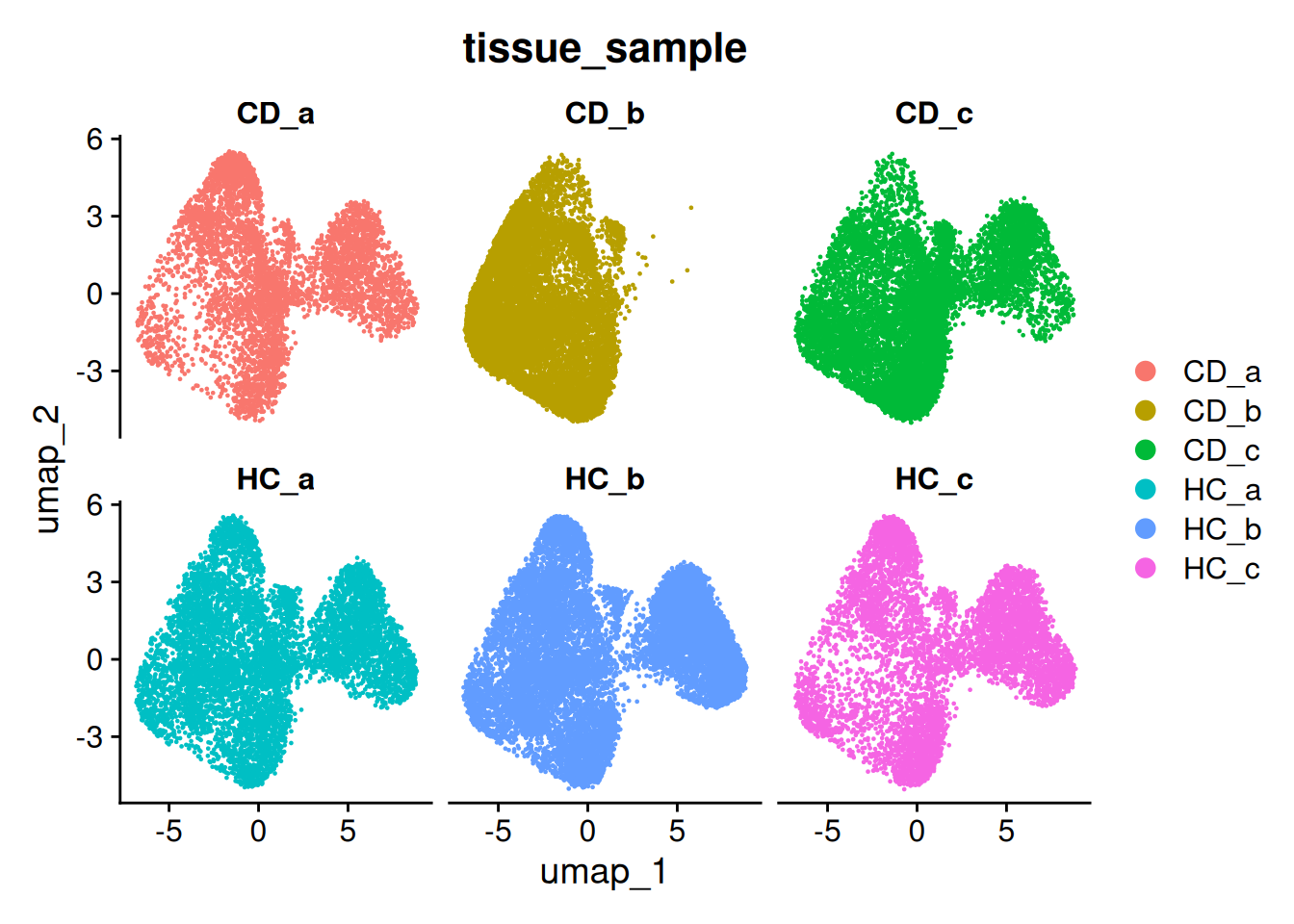 DimPlot(so, group.by='tissue_sample', split.by = 'tissue_sample', ncol = 3)