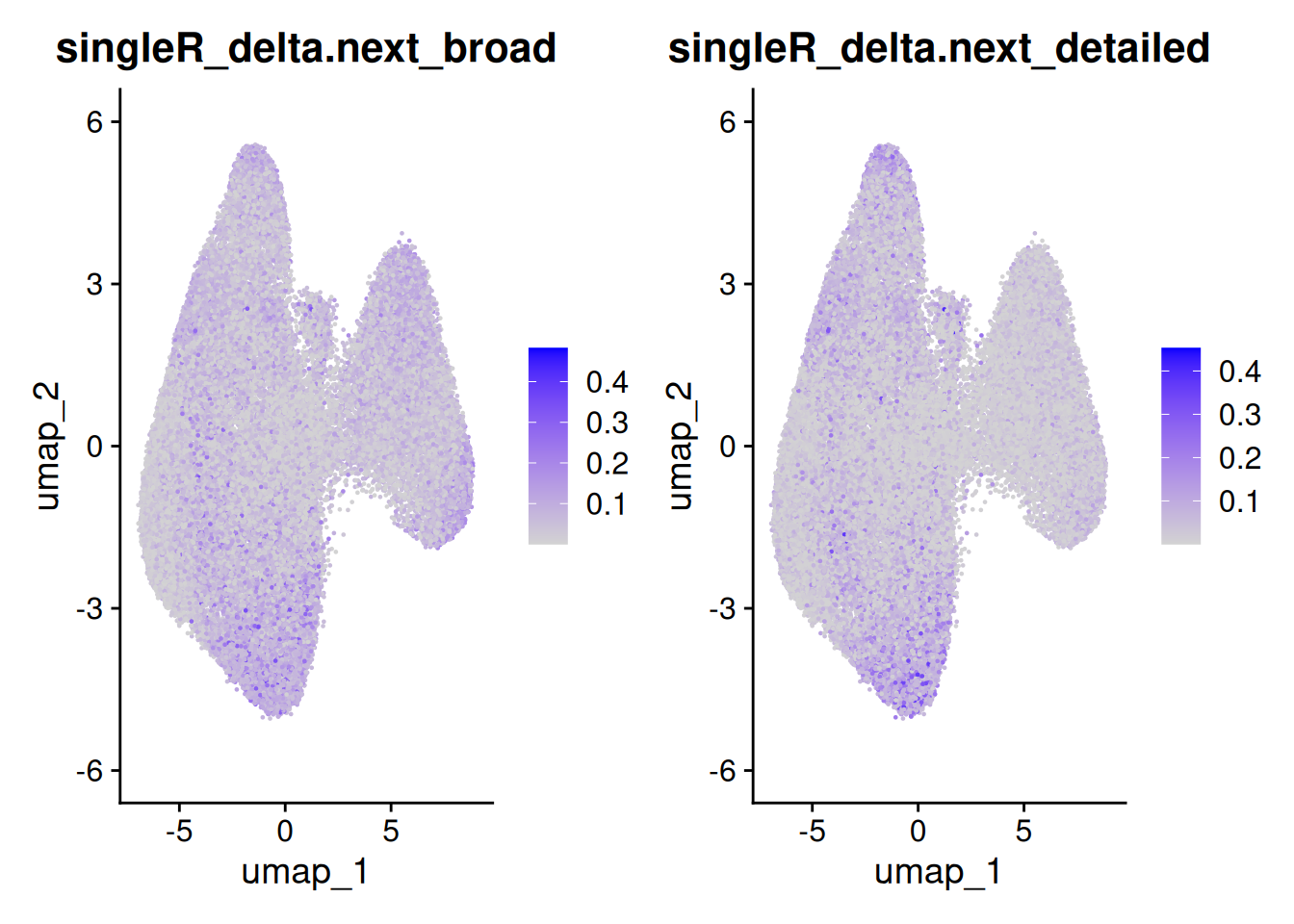 ref_norm_matrix <- assay(sce.ts_intestine.genename, 'X')The following code makes celltype predictions using the reference at the broad and specific annotation levels. It takes a few minutes to run - even with 8 cores.