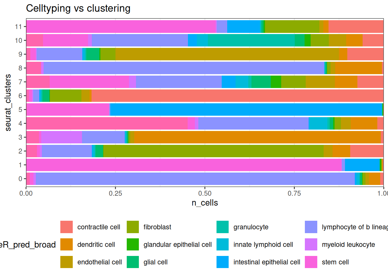 Now we can do some fun plots with our cell types - for instance to see if there’s change in proportions between samples. You could test this formally with propeller