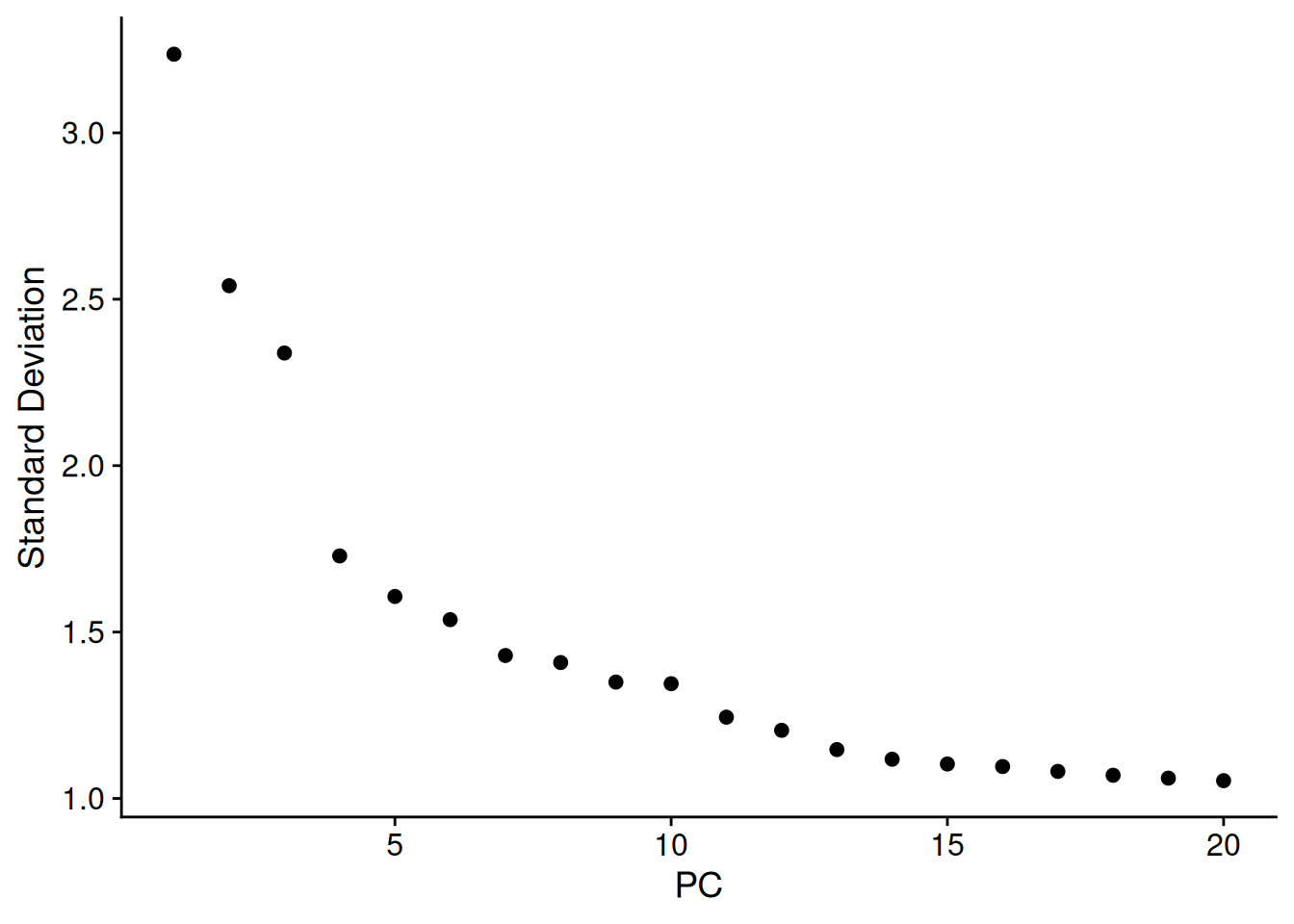 A general rule of thumb is to pick where the standard variation levels out in the plot below - the ‘elbow’. There is no harm in rounding up. Typically this is between 10-20, and is higher for more complex datasets.