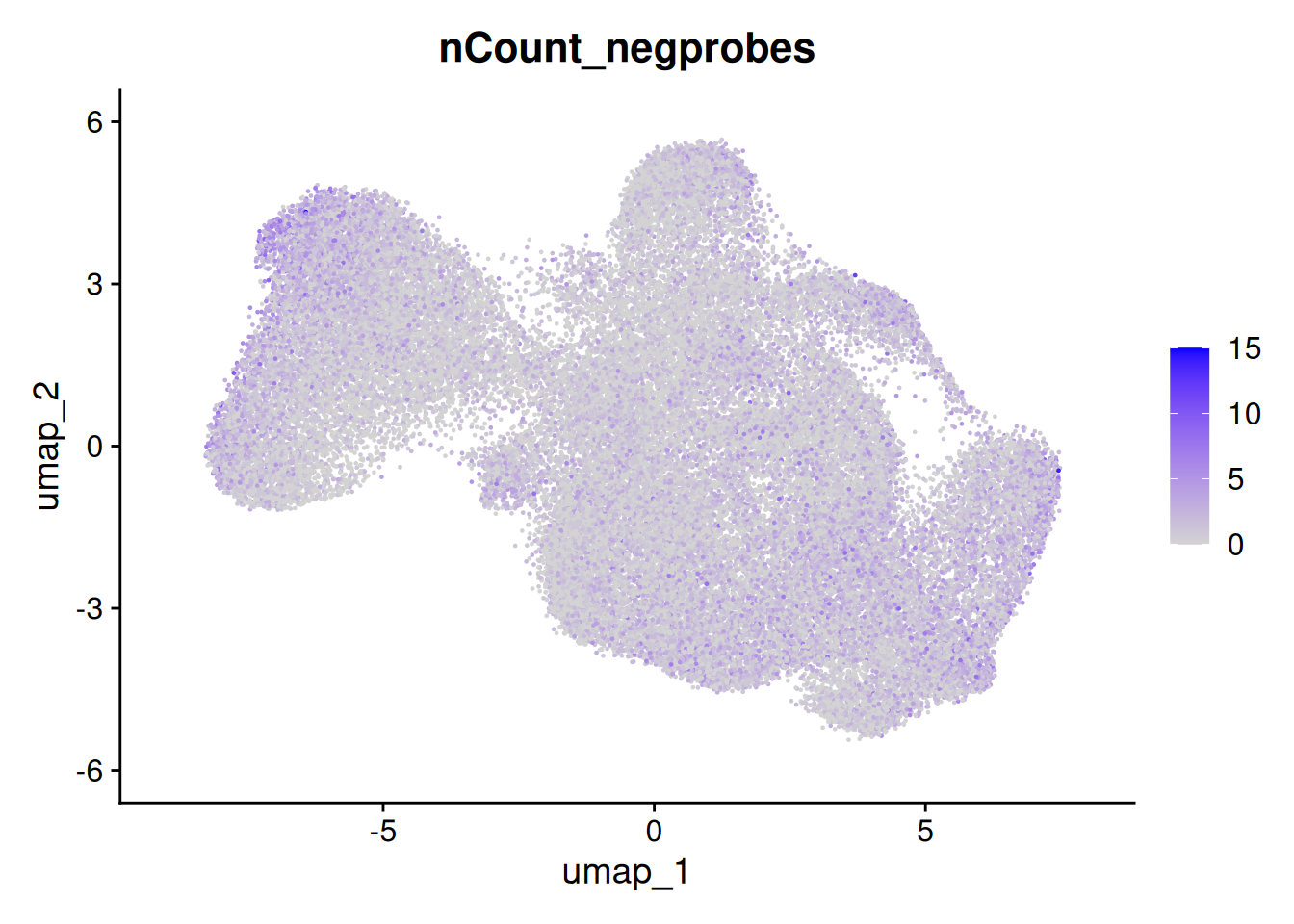 The metadata contains the number of total counts per cell (nCount_RNA) and total negative probe counts per cell (nCount_negprobes). Here we can see that the negative probe counts line up with our total counts. And that higher counts are concentrated in certain regions of the UMAP.