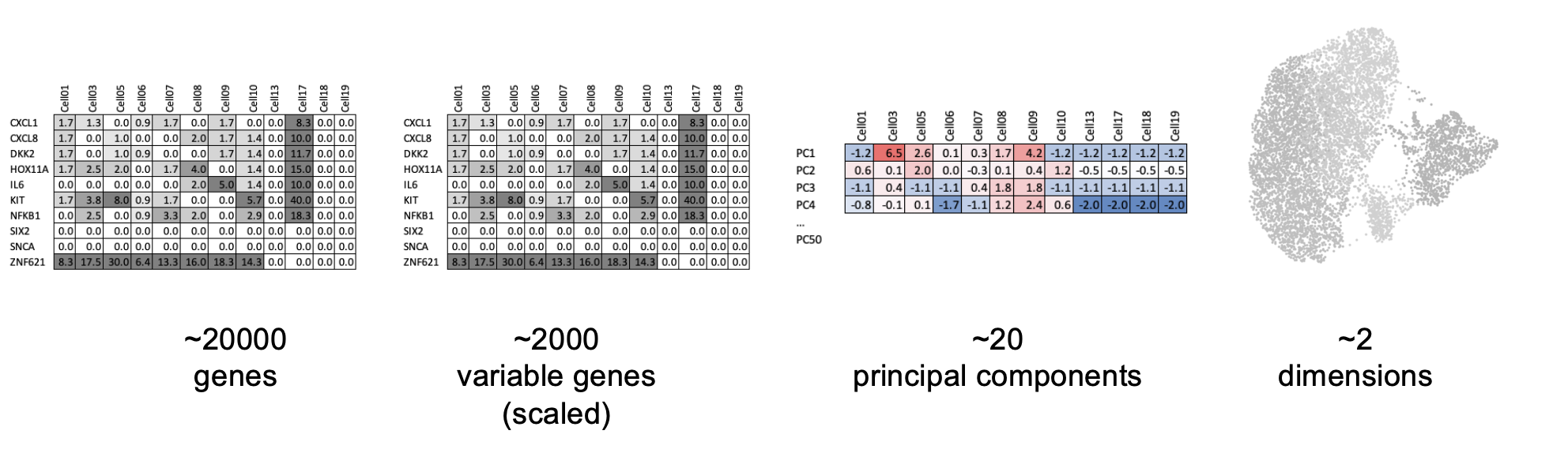 - Scaling the data: Highly expressed genes can overpower the signal of other less expressed genes with equal importance. Within the same cell the assumption is that the underlying RNA content is constant.