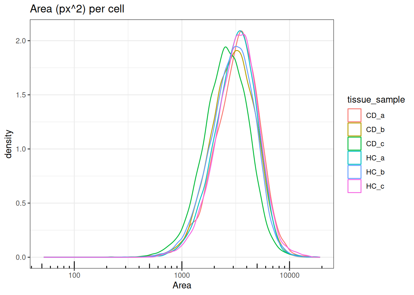 ggtitle("Area (px^2) per cell")
