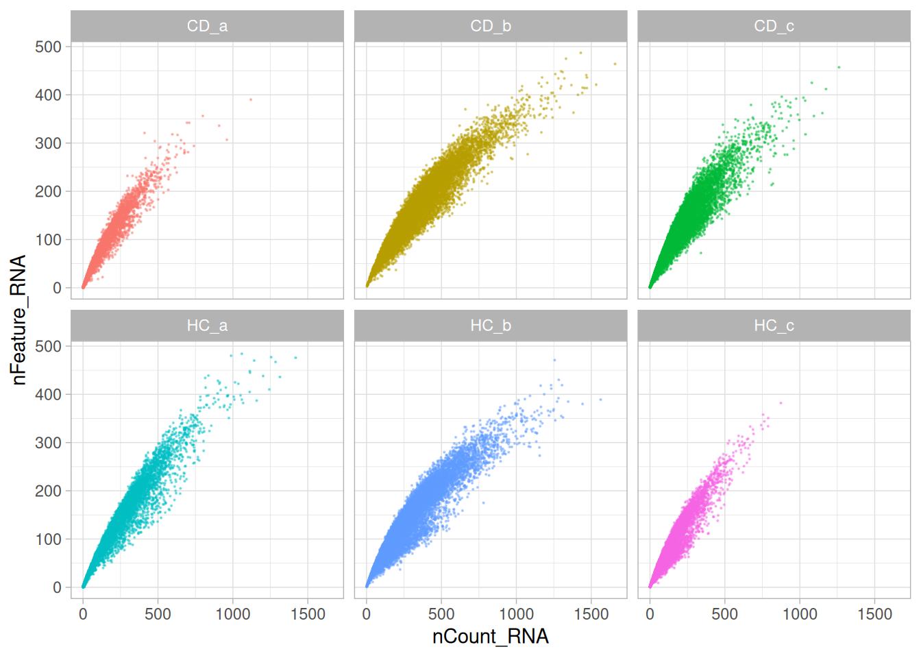The next plot compares total transcript counts (nCount_RNA) with the number of detected genes (nFeature_RNA) for each sample. The strong positive relationship indicates that most captured transcripts are successfully mapped to known genes, reflecting good data quality and sound probe hybridisation.