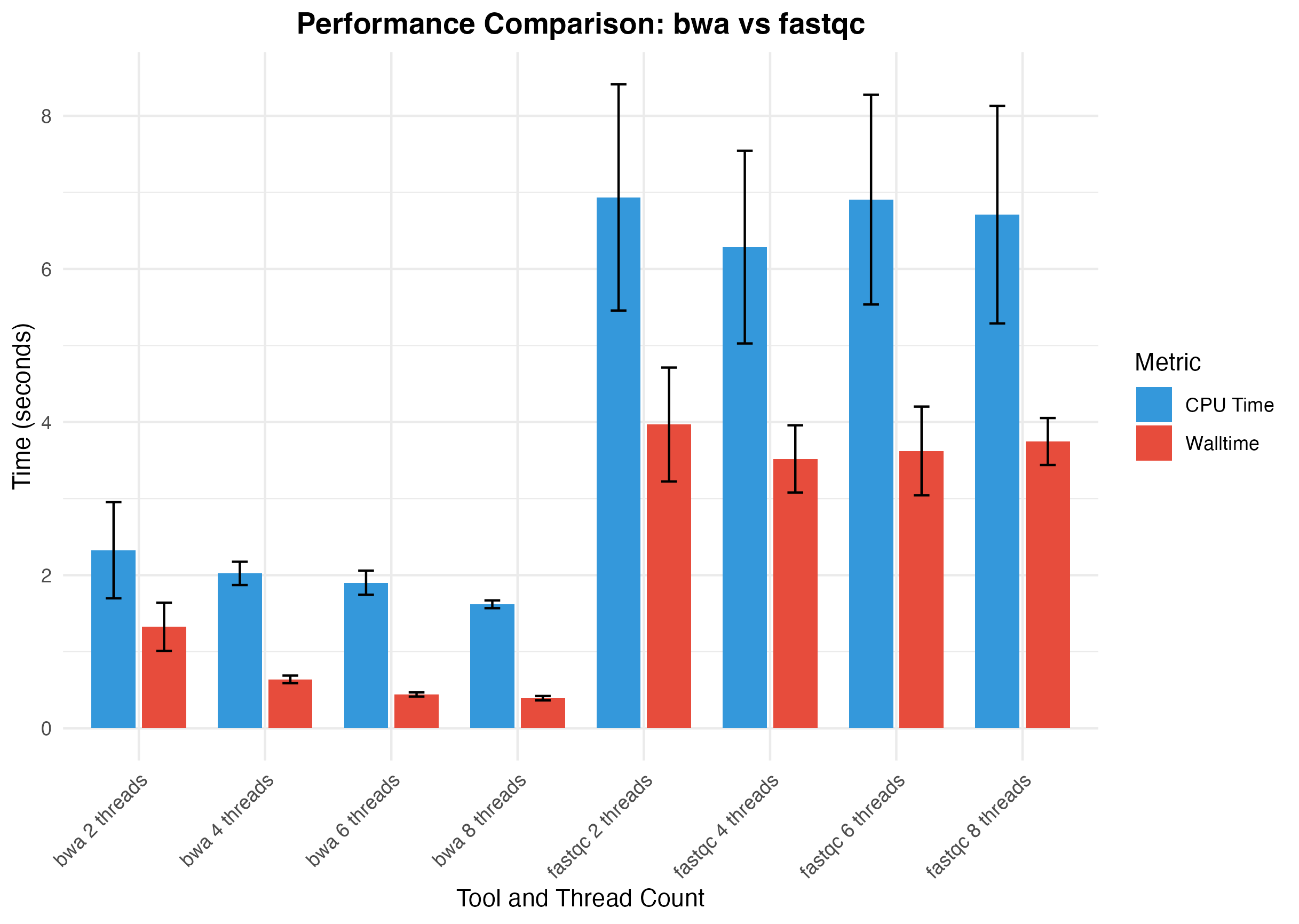 Recall this bar chart from Lesson 1.4, where we observed that BWA executes faster when assigned more cores but FastQC walltime remains constant.