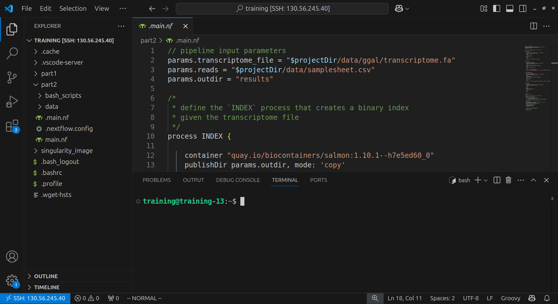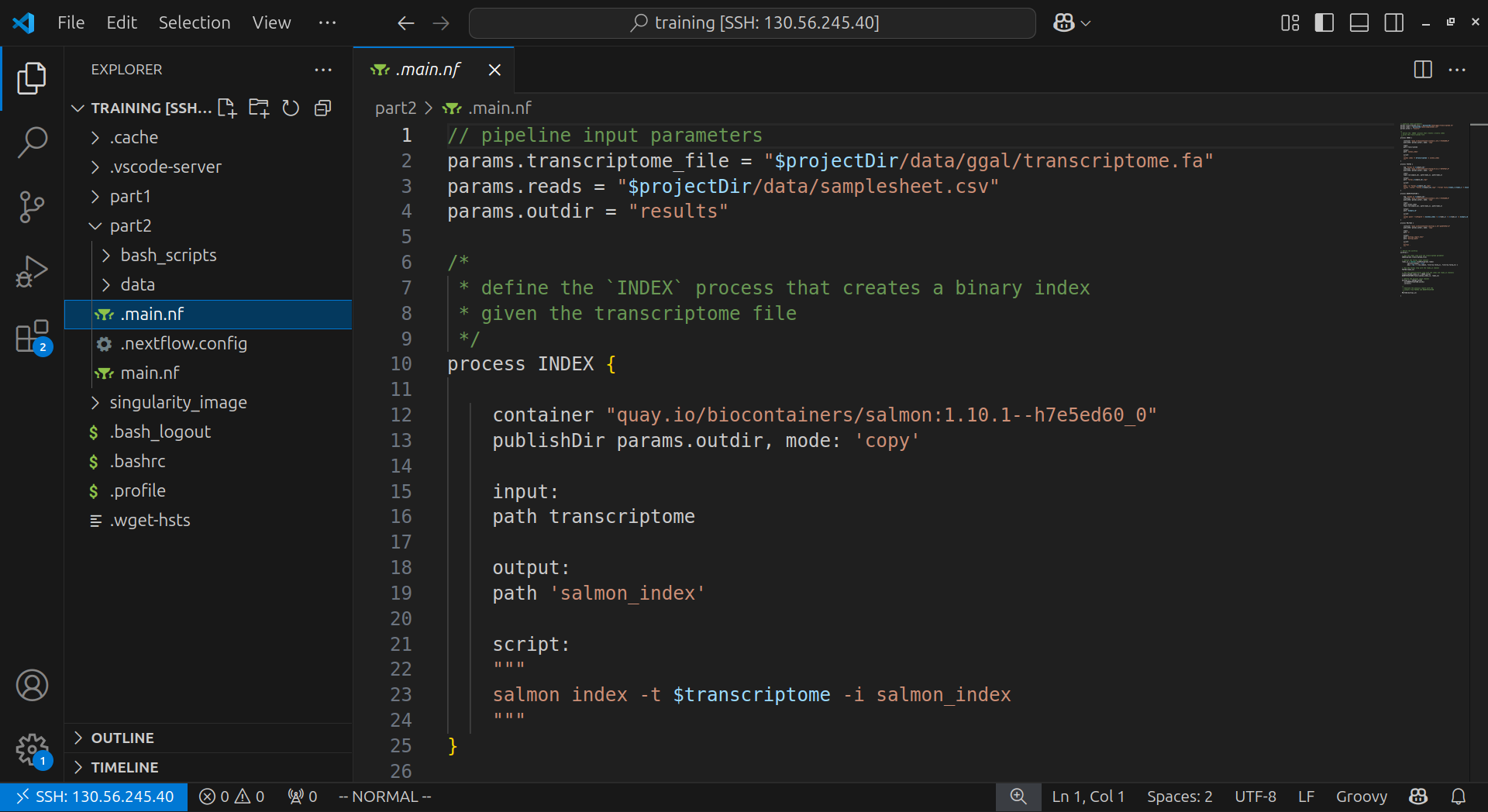 6. In the Explorer sidebar, select the part2 dropdown, then select .main.nf. This file will open in a tab. You may need to re-enter you password again.