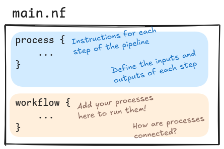 Nextflow pipelines are written inside .nf files. They consist of a combination of two main components: processes and the workflow itself. Each process describes a single step of the pipeline, including its inputs and expected outputs, as well as the code to run it. The workflow then defines the logic that puts all of the processes together.