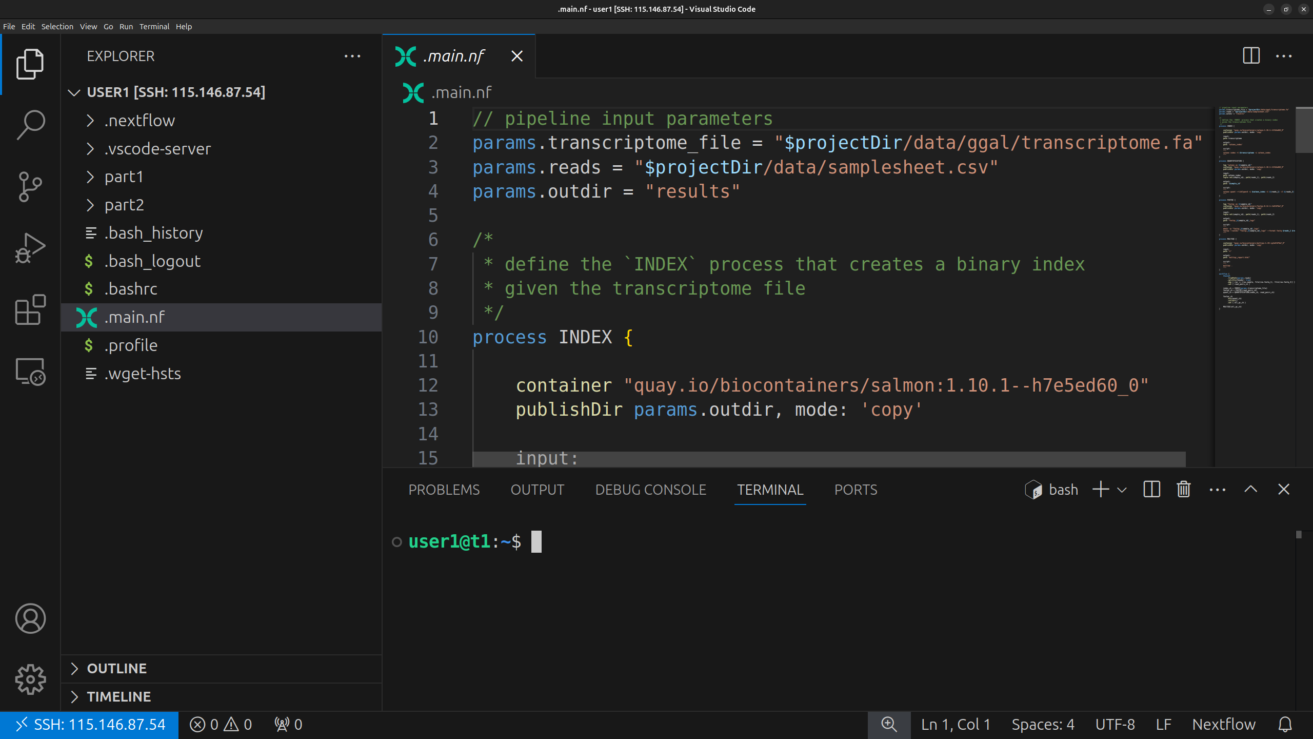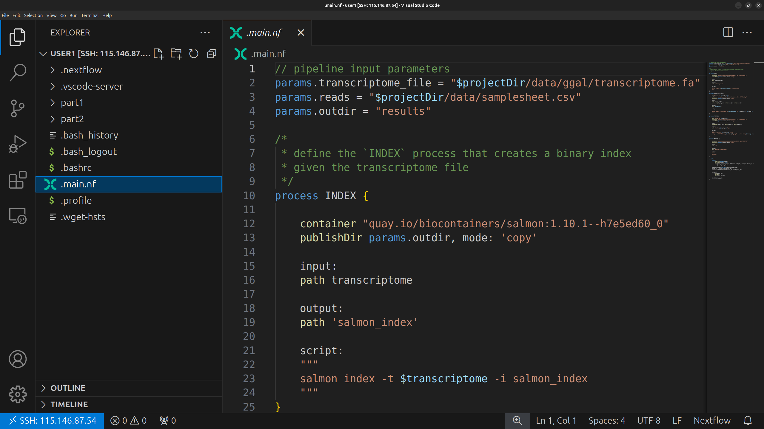 6. In the Explorer sidebar, select .main.nf. This file will open in a tab. You may need to re-enter you password again.